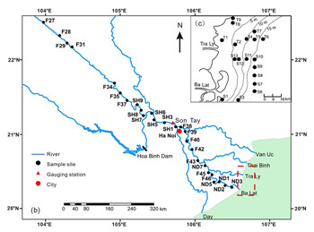 Figure 1. The red rectangle in Figure 1b indicates the (c) inset map, in which the sampling sites in the subaqueous delta are shown.