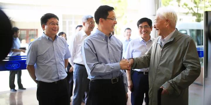 时任上海市委书记韩正2015年教师节前来校看望94岁高龄的陈吉余院士
