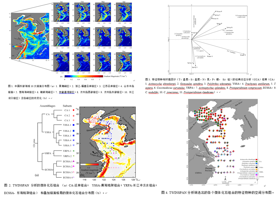 华东师范大学河口海岸学国家重点实验室刘东艳研究员及其研究团队,利用我国渤、黄、东海遥感观测、现场调查数据以及沉积物硅藻数据,开展了多学科交叉研究,发现中尺度陆架锋的物理过程对沉积物硅、甲藻群落的空间格局起到重要控制作用;以中尺度锋为边界的空间区划原则,可以更合理的解释浮游植物的空间变化规律以及环境指示意义。研究论文发表在国际生态领域重要学术期刊Global Ecology and Biogeography(D. Liu, et al. 2018) 。审稿人和编辑对该研究给予充分肯定,认为利用学科交叉建立的新方法简单合理,可以广泛推广到全球陆架海域研究中,进一步证实锋面在构建大陆架微体化石组合格局上的重要性,对于未来提高海洋沉积物中微体化石的释读性,提出相关的海洋生态理论具有重要参考价值。