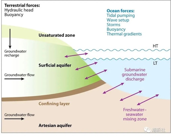 地表河口(Estuary)是我们熟知的河海交汇的区域。自古以来,多少文人雅士面对奔流入海的河水留下千古诗篇。然而在我们立足的地表下,地下水流亦缓缓流动,从内陆逐步流淌至近海。在海岸带区域,来自陆地的地下水与渗入海岸带地层中的海水徐徐混合,拓展出可达数公里的混合区域。这个看不见的滨海地下混合区就是地下河口(Subterranean Estuary),其中地下河口的部分外沿则是我们所熟知的海岸带沙滩(图1)。