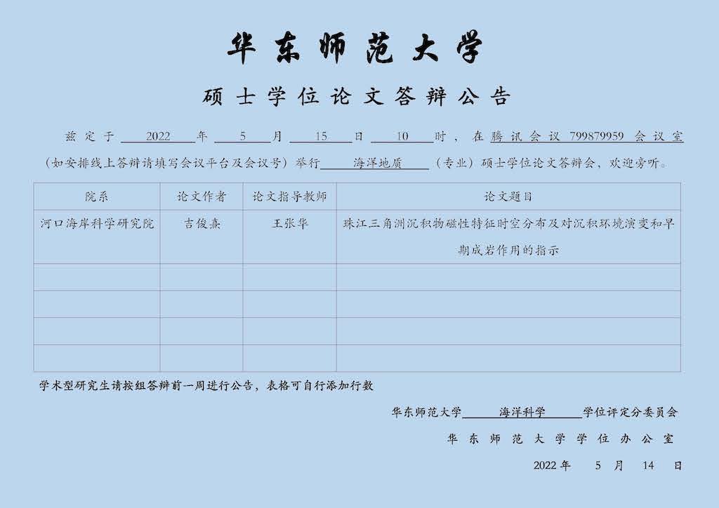 硕士学位论文答辩公告-吉俊熹(海洋地质,导师王张华)
