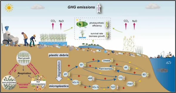 塑料进入湿地土壤中后会改变土壤特性、土壤微生物群落和酶活性。塑料独特的表面结构也为微生物定植提供了新的生态位,促进塑料圈层“Plastisphere”的形成和特定微生物的生长。湿地植物也会受到土壤中塑料的直接毒性作用。有研究表明纳米塑料附着在叶片表面后,可以通过气孔进入植物维管系统,阻碍水分和养分的运输,造成植物的氧化损伤并抑制光合作用。此外,由于湿地生态系统的碳汇功能,湿地塑料污染下温室气体(GHG)排放的变化已成为当前的研究热点。塑料可以通过改变土壤的物理化学性质、微生物群落和酶活性来影响土壤的生物地球化学循环。