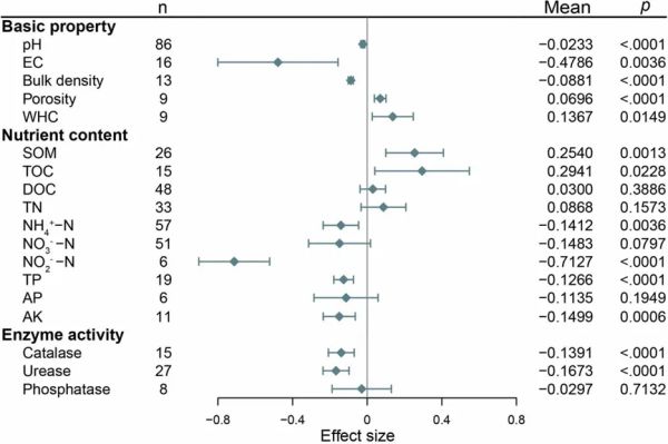 图3 塑料污染对湿地土壤特性(土壤基本性质、土壤养分含量和土壤酶活性)的影响