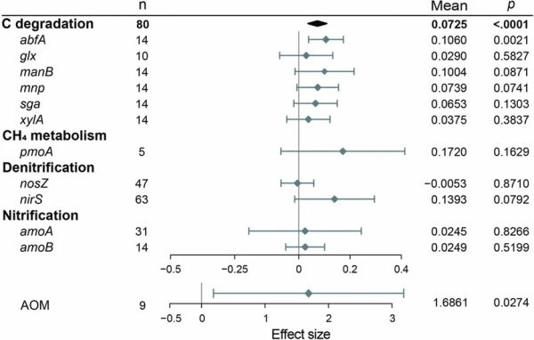 结构方程模型(SEM)的结果揭示了塑料污染对土壤性质、微生物多样性、植物特征、与C和N循环相关的功能基因以及温室气体排放的直接和间接影响(图7)。在塑料污染下,土壤pH对TP、DOC和过氧化氢酶活性有直接的正向影响,而对磷酸酶活性和NO2−–N有负向影响。TP、NO3−–N、NH4+–N和AK显著促进了磷酸酶活性,TN促进了过氧化氢酶活性,TP和TN对脲酶活性具有正向影响。微生物多样性指数之间存在显著的正相关关系。同时,TP和AK也显著促进了植物生物量的累积。土壤和植物性质的变化进一步影响了温室气体排放。具体来说,CO2排放受到TP的负面影响,而TN、DOC和abfA则显著促进了CO2排放。CH4排放受DOC和植物生物量的正向影响,受到TP的抑制。N2O排放受到DOC和NO3−–N的含量的负向影响。