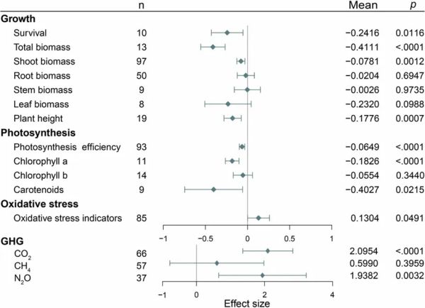 图6 塑料污染对湿地植物(植物生长、光合作用和氧化应激指标)和GHG排放的影响