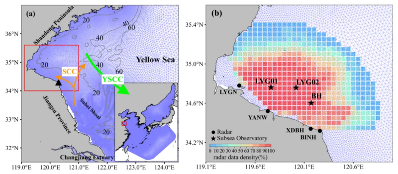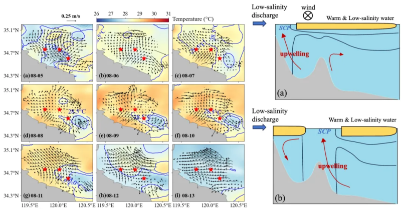 海洋流场是海洋环境的重要组成部分,显著影响着生态系统和人类活动,尤其在沿岸区域,其动力复杂且变化迅速,受到风场、潮汐、径流等多种因素共同作用。这种动力特性也导致了流场显著的三维结构。其中,能够垂向输送营养物质、污染物及沉积物的上升流,显著影响着局地水体特征乃至生态环境。除了Ekman输运引起的典型上升流外,风、地形叠加河口低盐羽流扩展与迁移等自然、动力要素也会综合影响上升流的形成、发展和消亡。作为上升流重要识别标志的海表冷水区,是营养物质重要的输送通道,也是支持区域生态动力系统并进行生态灾害防护的关键区域。本研究借助高频地波雷达(HF-Radar)高时空分辨率的探测能力,并综合海床基监测、卫星遥感、数值模型等多源数据与方法,识别并分析了南黄海区域上升流与表面冷水区的动态变化(图1),为海岸带资源管理、生态保护及工程建设提供理论支持。