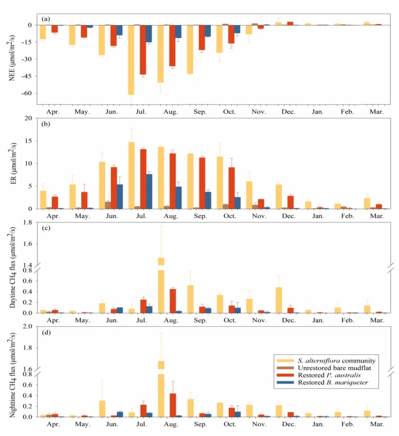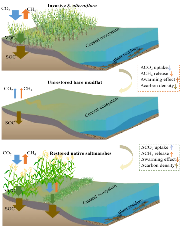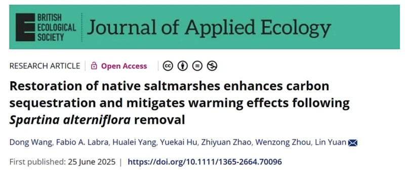 Wang, D., Labra, F. A., Yang, H., Hu, Y., Zhao, Z., Zhou, W., & Yuan, L. (2025). Restoration of native saltmarshes enhances carbon sequestration and mitigates warming effects following Spartina alterniflora removal. Journal of Applied Ecology, 00, 1–13. https://doi. org/10.1111/1365-2664.70096