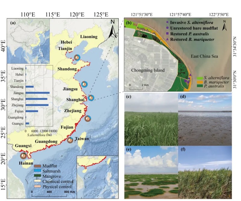 作为全球最具威胁性的100种外来生物之一,互花米草在全球许多地区的海岸带入侵扩张,并对全球滨海生态系统构和功能造成严重威胁。为遏制其入侵、恢复退化的滨海生态系统,全球范围内采取了多种措施来治理互花米草,并在此基础上积极地恢复本土植物。2022年,为保障滨海生态安全,中国启动了《互花米草防治专项行动计划(2022-2025)》,力争到2025 年,全国互花米草得到有效治理。然而,作为典型的C4植物,互花米草具有强大的固碳能力,清除互花米草会对滨海湿地碳汇能力产生怎样的影响,以及后续的本土盐沼植物恢复能否补偿由于互花米草治理产生的碳汇损失尚不清楚。本研究通过整合生态系统碳通量观测与碳储量动态调查,揭示了互花米草清除及本土盐沼植物恢复后滨海湿地碳汇能力的动态变化,以期为入侵物种管理、生物多样性保护和蓝碳功能提升等多目标协同的滨海湿地保护修复提供科学依据。