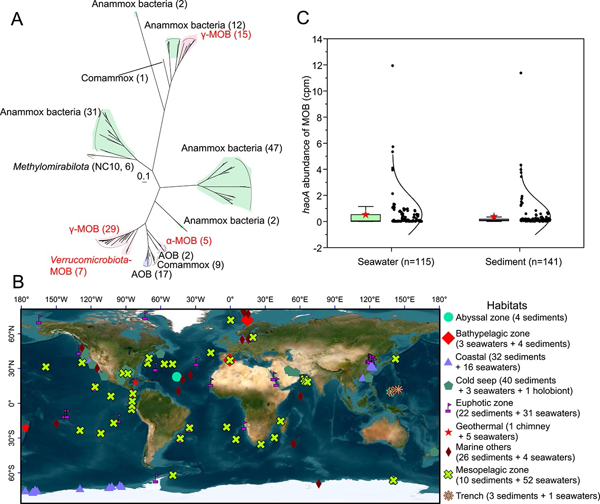 图1 全球海洋MOB 中mHAO蛋白A亚基系统发育树及haoA基因分布