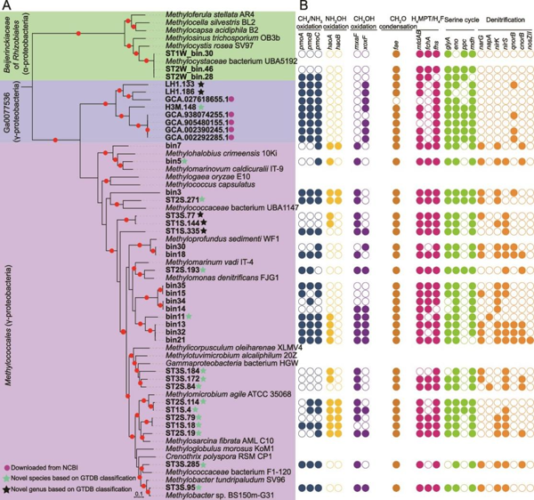 华东师范大学河口海岸全国重点实验室滨海湿地微生物生理生态研究团队通过分析全球海洋宏基因组,发现含有羟胺氧化还原酶HAO的MOB在各类海洋环境中广泛存在,尤其在甲烷渗漏区和河口区域丰度更高(图一)。其中,γ-变形菌(Gammaproteobacteria)分布最广泛。通过基因组组装,团队在γ-变形菌纲中鉴定到一个以前未发现的具有潜在好氧甲烷氧化能力的目—Ga0077536,这表明海洋有氧甲烷氧化菌多样性仍有待深入探索。此外,在一个隶属于γ--变形菌MOB组装基因组中发现从硝酸盐到氮气的完整反硝化途径(图二),这是首次在MOB中鉴定到该途径。基于上述发现,研究团队推测MOB是海洋N2O的一个潜在的源。