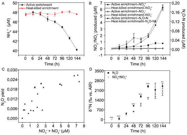 为了验证上述假设,研究团队从长江口采集了水体和沉积物样品,并对好氧甲烷氧化菌(MOB)进行富集培养。通过添加传统氨氧化微生物抑制剂以及在无氨培养基中进行多轮传代培养,两个月后获得了不含传统氨氧化微生物、MOB含量较高的富集体系。随后,基于该富集体系,研究人员分析了MOB持续进行氨氧化的能力,结果显示该体系可维持长达144小时的氨氧化过程,持续将氨氧化为硝酸盐,并伴随N₂O的产生。利用¹⁵N标记的¹⁵NH₄⁺开展的进一步实验表明,所生成N₂O中的δ¹⁵N值介于977‰至2391‰之间,显著高于同期亚硝酸盐/硝酸盐库中的δ¹⁵N值。这一结果说明,所产生的N₂O至少有一部分直接来源于¹⁵N标记的铵盐库。为进一步支持上述发现,团队进一步比较了添加氨前后样品的宏基因组与转录组数据。分析显示,编码甲烷单加氧酶的转录本在加氨后显著上调,表明甲烷单加氧酶在该富集体系的氨氧化过程中起关键作用。同时,与羟胺氧化相关的转录本也明显上调,提示氨氧化过程可能与N₂O的生成存在代谢偶联。该研究为阐明海洋N₂O的来源及其通量的精确估算提供了重要科学依据。