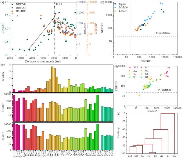 三峡大坝(TGD)成为长江干流营养盐输送格局关键调控节点,其拦截效应显著改变营养盐比例。研究发现,大坝上游至TGD段,DIN:DSi、DIN:DIP和DSi:DIP比值均显著上升;而TGD至河口段,这些比值则明显下降。这一结果表明,大型水利工程(特别是三峡大坝)深刻改变了河流营养盐的输送格局和生物可利用性,对下游及河口生态系统产生深远影响。根据限制性营养盐判定标准,长江干流及多数支流均处于磷限制状态(Si:P>22,N:P>22)。而且,相邻的主要支流具有相似的营养盐结构特征。