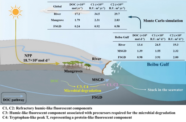 红树林生态系统有着较高的初级生产力和较高的碳埋藏潜力,同时也是向近海输送溶解有机碳(DOC)的重要来源。尽管全球红树林分布面积不足陆地总面积的0.5%,但其通过海底地下水排放(SGD)等途径向海洋输出的DOC通量,可占全球河流DOC总输送通量的约10%,凸显了其在全球碳循环中的关键地位。目前,SGD已被确认为红树林DOC向海输送的重要路径之一。然而,关于经由该途径输出的红树林源DOC的不同组分及其输送通量,目前仍缺乏系统性的认识,这限制了对滨海蓝碳循环过程的准确理解与量化。