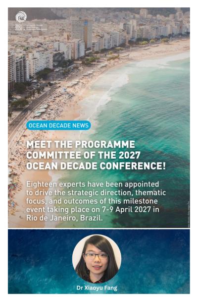Future Earth Coasts (FEC) is delighted to announce that Dr. Xiaoyu Fang, Co‑Executive Director of FEC and Assistant Research Professor at the State Key Laboratory of Estuarine and Coastal Research (SKLEC), East China Normal University, has been appointed as a member of the Programme Committee for the 2027 Ocean Decade Conference. The appointment was announced by the UN Ocean Decade on 15 January 2026, alongside the selection of 18 global experts who will guide the strategic direction of the 2027 Conference.