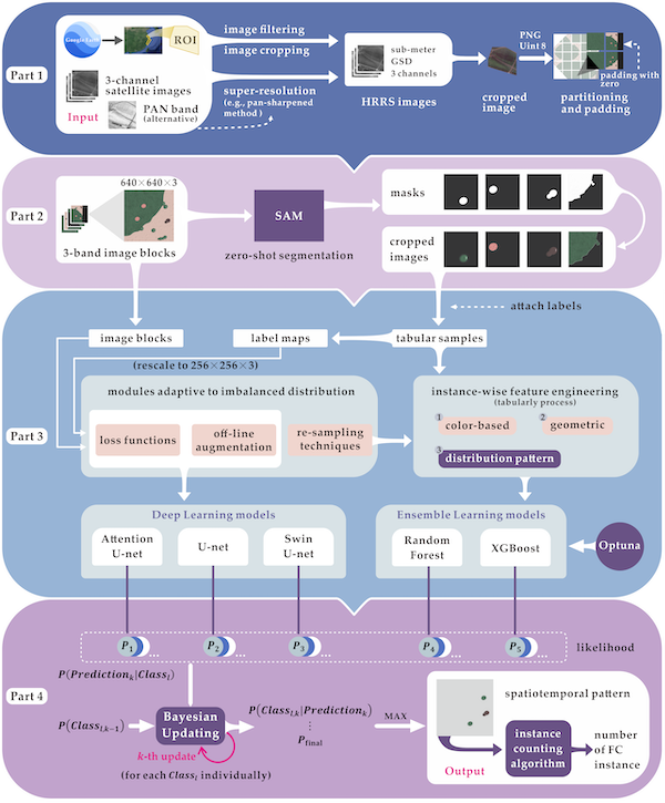 在上述背景下,研究的关注点不在于训练一个更强的分割网络,而是设计一个完整的、受现实条件(数据有限、计算资源有限、影像质量方差大等)约束的遥感应用框架,实现自动的“识别 + 计数 + 时空分析”的一体化流程(图1):在零样本分割大模型(SAM)提供候选实例的基础上,结合多种类不平衡约束策略(如重采样技术、多类别Equalized Focal Loss、离线数据增强等)与“色彩-几何-分布模式”关键特征构建,利用单一集成学习(Random Forest、XGBoost)和深度学习(U-Net、Attention U-Net、Swin-Unet)模型进行“精灵圈”独立识别;通过类别不平衡的贝叶斯概率更新来融合模型输出,获得更优识别结果;针对单阶段语义分割难以直接获得“精灵圈”实例数量以及现有图像聚类算法效率低等挑战,提出了单参数计数模块,通过按行检索关键“入口”像元,快速获得“精灵圈”实例数量。