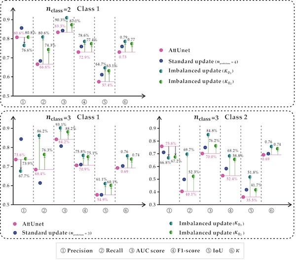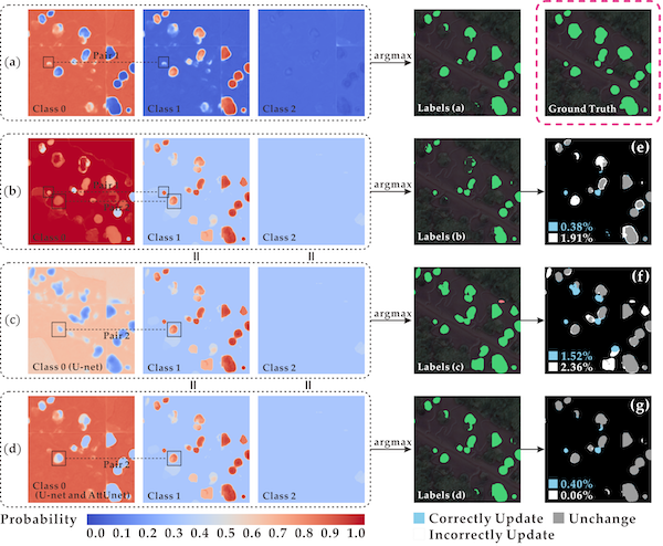图4. 贝叶斯更新过程可视化:由 Attention U-net 、标准贝叶斯方法、不平衡贝叶斯方法更新得到的概率与正确/错误更新的比例