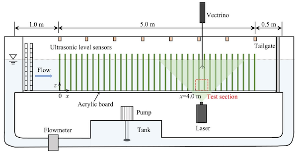 在滨海湿地生态系统中,水生植被不仅有助于维持生态稳定、美化环境,还可通过改变水流结构与紊动特性,直接影响地貌演变过程。因此,深入揭示植被对水流结构的作用机制,具有重要的科学与工程意义。以往研究已通过室内实验、数值模拟与野外观测等手段,对植被水流相互作用开展了广泛探讨。其中,近底水动力特征作为水沙运动研究的关键环节,尤其受到关注:由于粘性底层极薄的流速梯度是计算床面切应力的关键依据,而床面切应力又直接影响泥沙的起动与输运,因此该区域的水动力特性成为理解植被影响下河床演变的核心焦点之一。