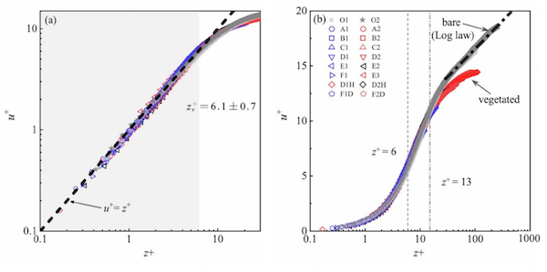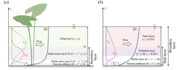 近日,华东师范大学河口海岸全国重点实验室生态水沙动力学研究团队,在植被湍流边界层理论研究方面取得重要进展。该研究基于自主研发的粒子图像测速与粒子追踪测速(PIV-PTV)耦合超高分辨率测量系统,成功捕捉到植被水流粘性底层内的高精度流速分布特征,提出了适用于植被水流近底区的新流速统一分布律。此外,研究通过引入弥散应力模型对传统混合长度理论进行修正,构建了新的床面切应力预测模型。相关成果以Near-bed velocity law and bed shear stress in vegetated flows为题发表于流体力学领域顶级期刊Journal of Fluid Mechanics,第一作者和通讯作者分别为河口海岸全国重点实验室徐元副研究员和徐凡副研究员,合作作者包括华东师范大学河口海岸全国重点实验室硕士生马思远、何青研究员、北京交通大学陈启刚副教授、中国农业大学钟强教授以及美国麻省理工学院Heidi Nepf教授。