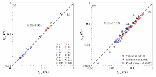 图6 实测床面切应力与预测床面切应力对比。(a)本研究实测数据。(b)前人研究数据。