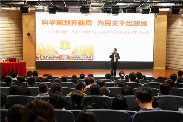 会上,卜新兵老师围绕2026年全国“两会”的核心精神与实践要求,从两大核心维度展开系统阐释:一是从复杂变局中深刻解读2026年全国“两会”的特殊背景与时代意义,结合当前国内外发展形势,阐明“两会”对国家发展全局的战略指引;二是从报告和讲话中精准把握今年“两会”的主要议程与关注重点,拆解政府工作报告、十五五规划纲要等核心文件的关键部署,解读经济发展、民生保障、科技创新、绿色发展等领域的新要求。同时,卜老师结合树立和践行正确政绩观的深刻内涵,阐释了新时代党员干部与高校师生如何以正确政绩观履职尽责,将“两会”精神转化为教书育人、科研报国的实际行动,以实干担当服务国家战略与教育事业发展。